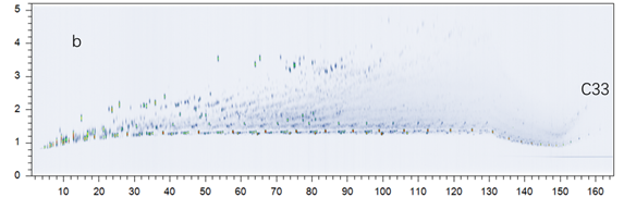 全二维气相色谱是最近发展成熟的一种全新的色谱分离手段,因其分离度好、峰容量大、灵敏度高、化合物排列有规律等优点广泛用于挥发性复杂样品的分析应用,特别在石油化工领域的分离分析应用上取得了很好的效果。石油有机地球化学研究中, 有关凝析油的成因、热演化程度及母质来源的探讨, 需要更为详细的凝析油烃类组成数据。凝析油组成复杂,轻烃含量高,常规石油样品分析方法无法满足凝析油样品的分析要求。而全二维气相色谱可以显著提高凝析油分析的分离效果及定性定量的准确性,结合高扫描速率的质谱技术,实现C3-C8范围内轻烃的详细组分定量和C8以上烃类的族类分析。目前全二维气相色谱-质谱法已成为凝析油烃组成分析的石油天然气行业标准方法(SY_T7315-2016)。