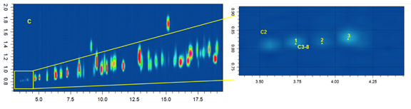 针对C3-C8段轻组分的精细分离,其测试结果与文献结果类似(图2)。化合物定性结果通过另外的GCMS实验进行验证。